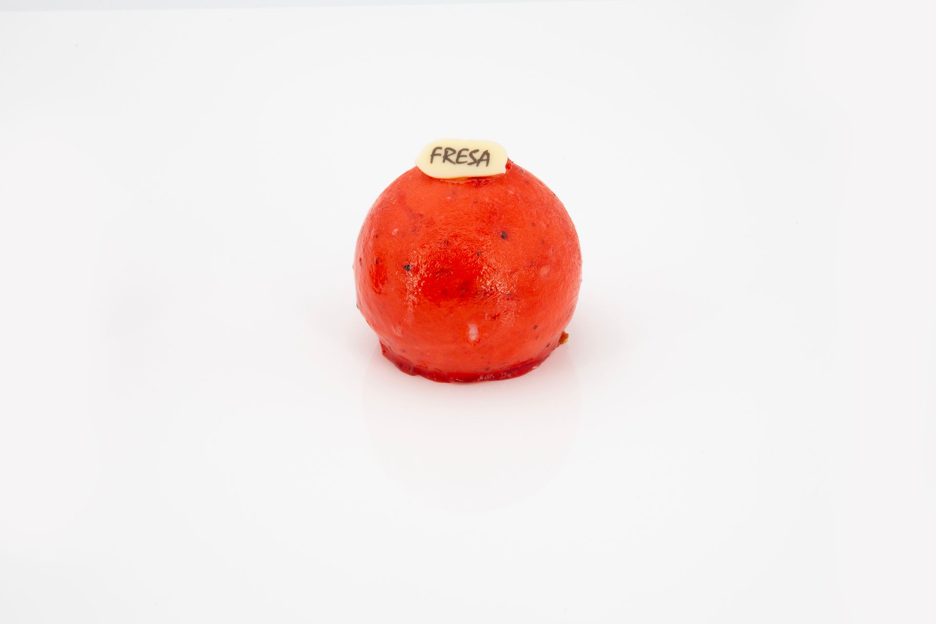Bola rellena de mousse de fresa con una base de bizcocho y recubierta con una fina capa pintada de chocolate rojo.