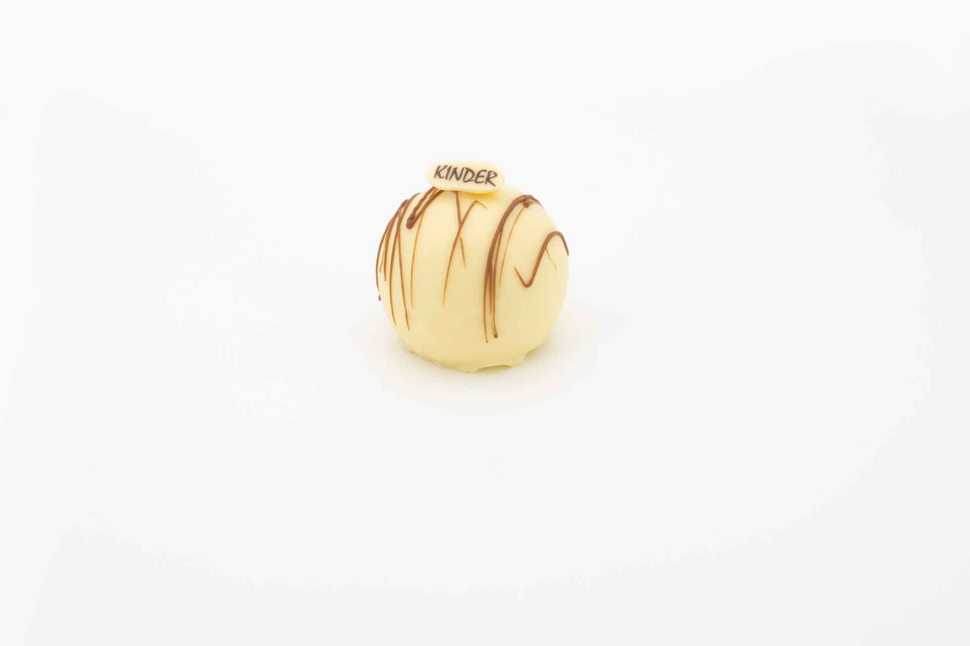 Bola rellena de mousse kinder con una base de bizcocho y cobertura de chocolate blanco rallado con chocolate de leche.