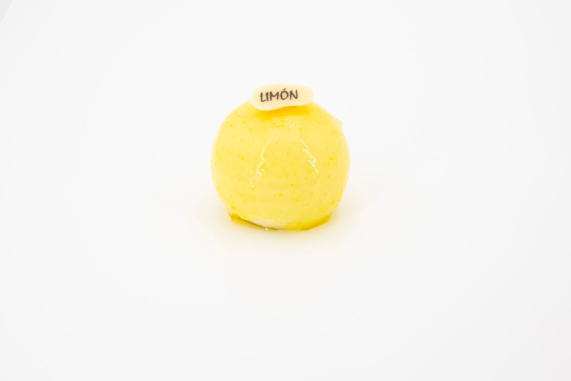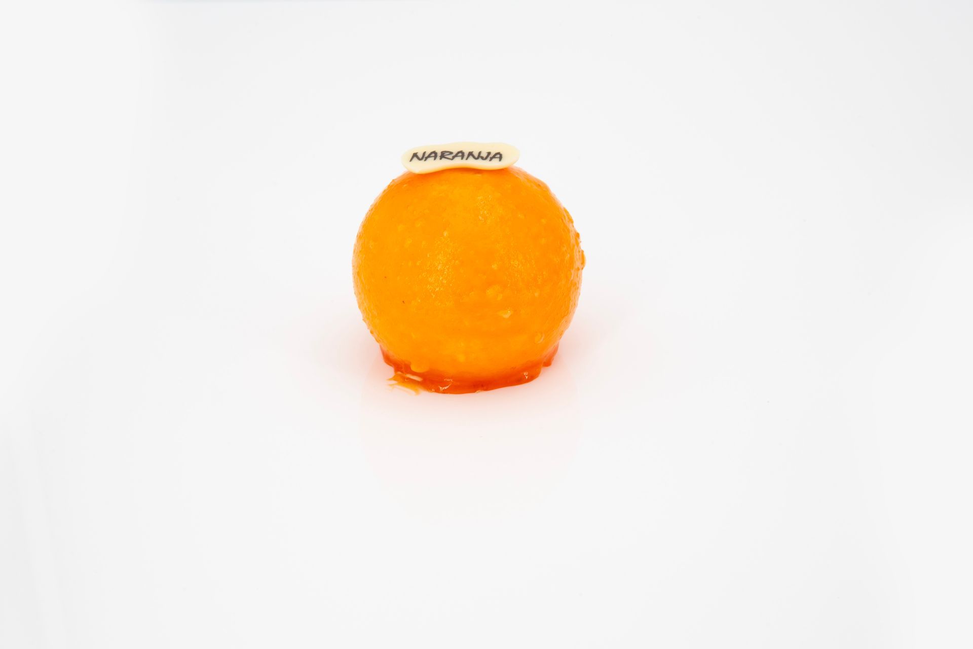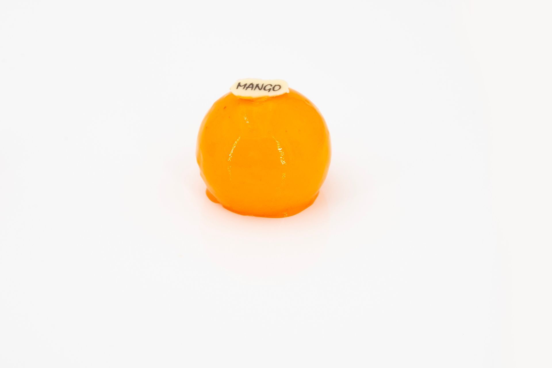 Bola rellena de mousse de mango con una base de bizcocho y baño de gelatina.