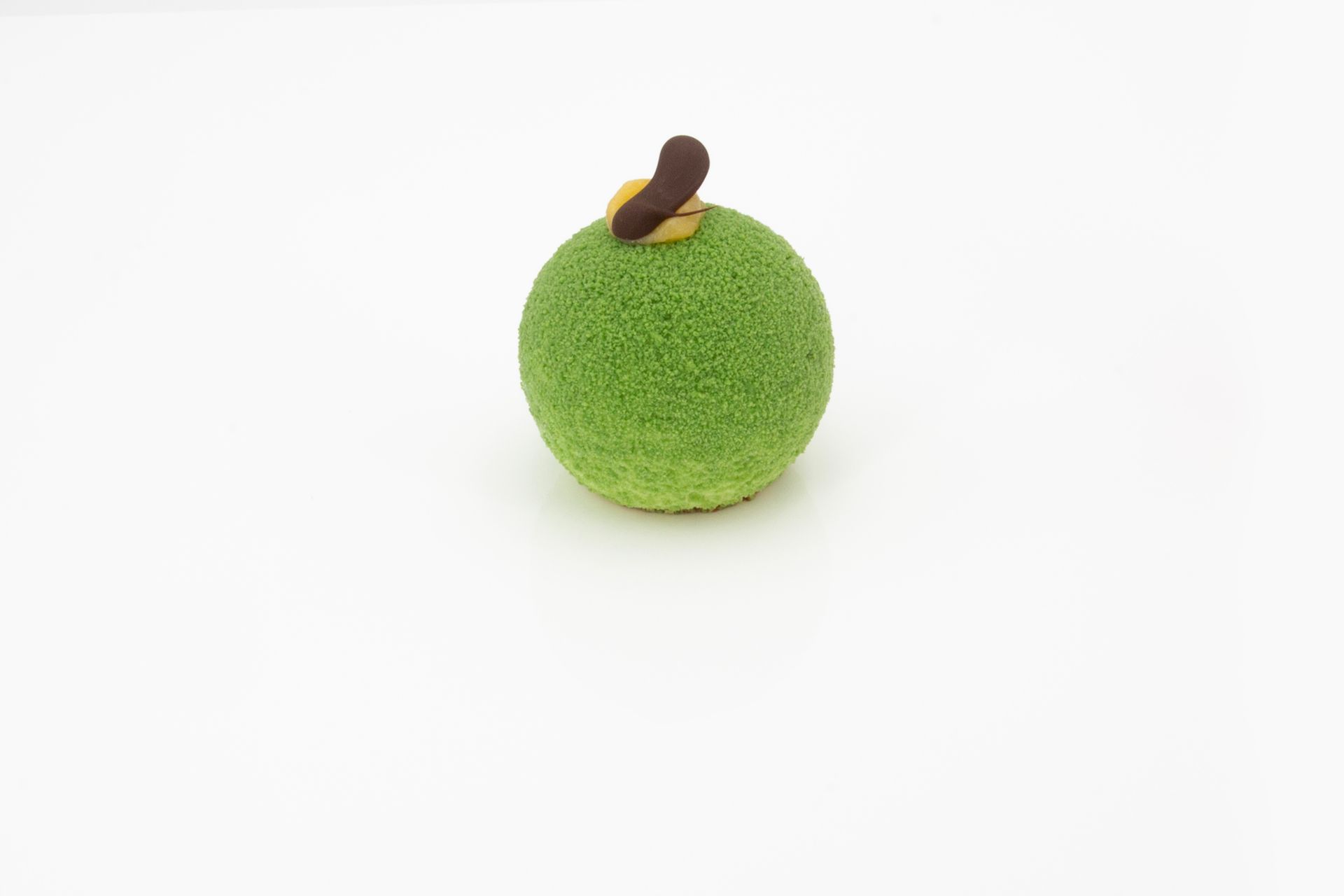 Bola rellena de mousse de manzana con una base de bizcocho y una fina capa de pintura verde.