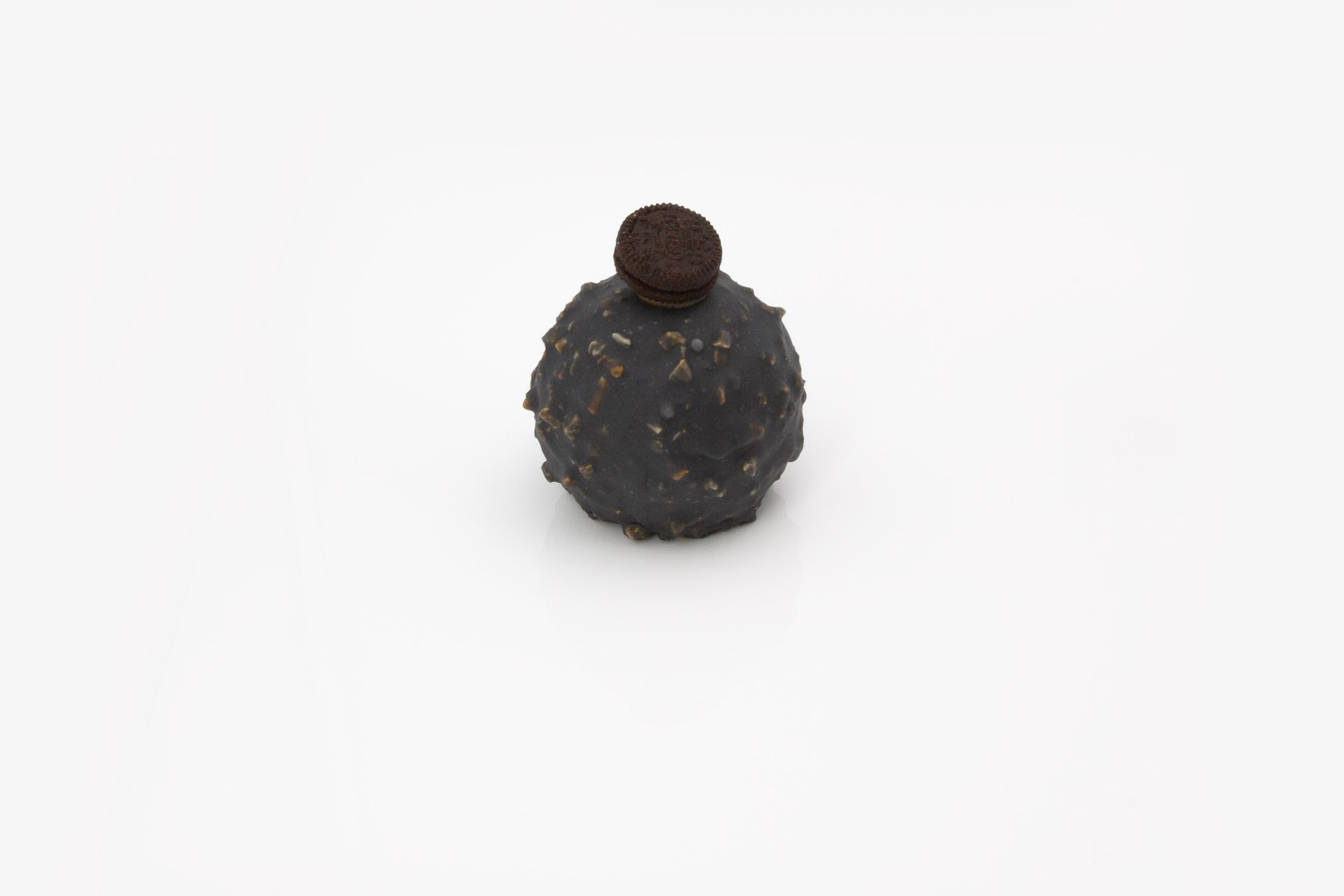 Bola rellena de nata con topping de oreo, una base de bizcocho y baño crocanti.