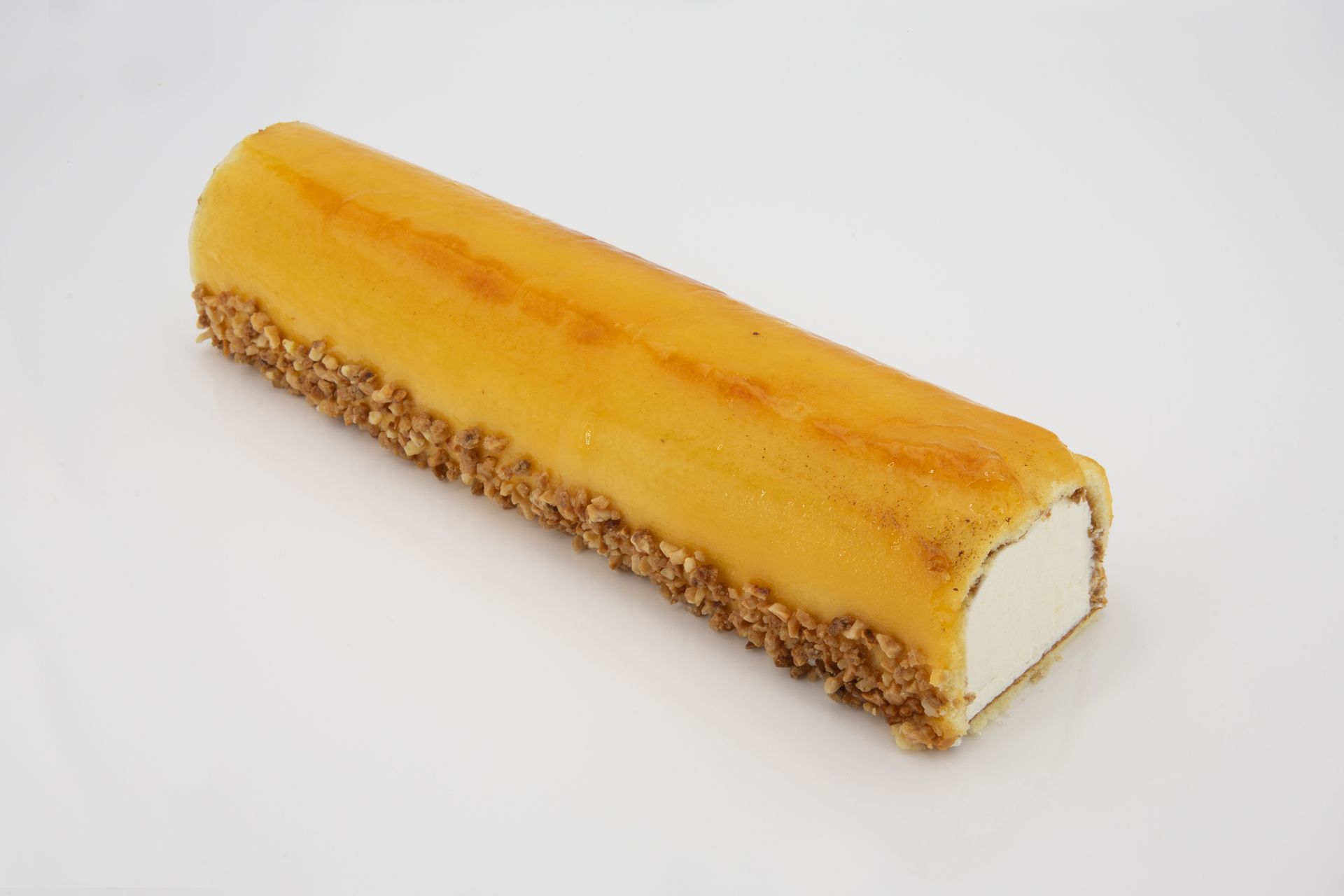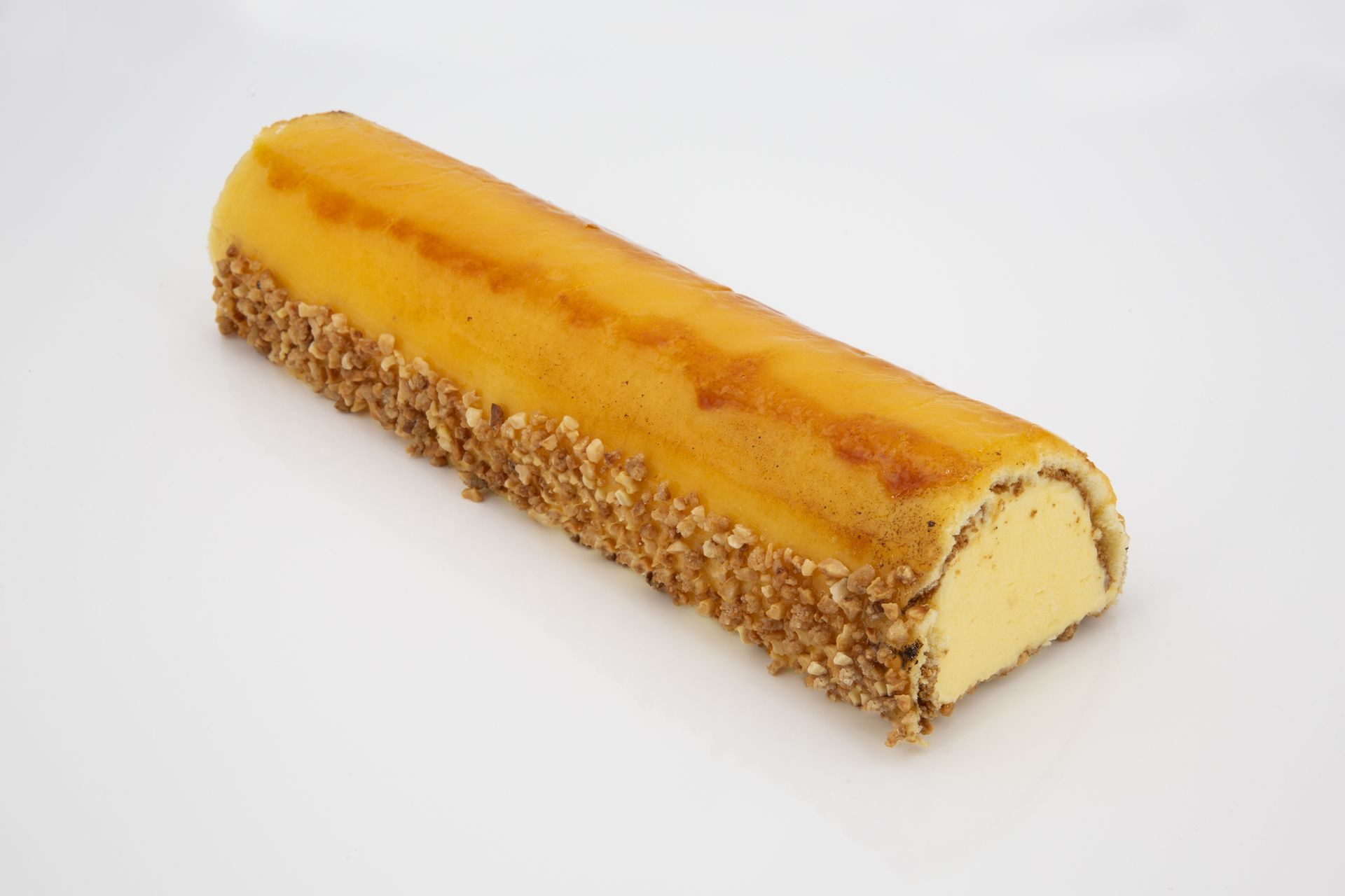 Plancha de bizcocho enrollada y rellena de crema. Cubierta de yema quemada y crocanti.