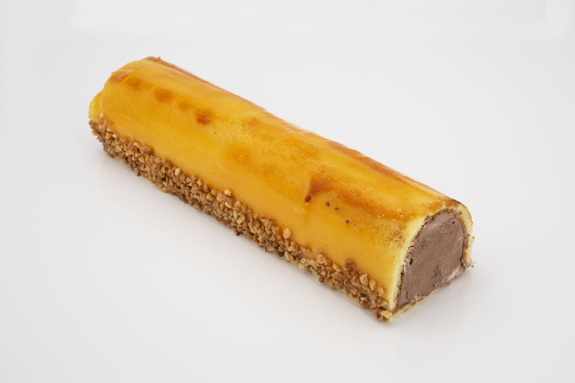 Plancha de bizcocho enrollada y rellena de trufa. Cubierta de yema quemada y crocanti.