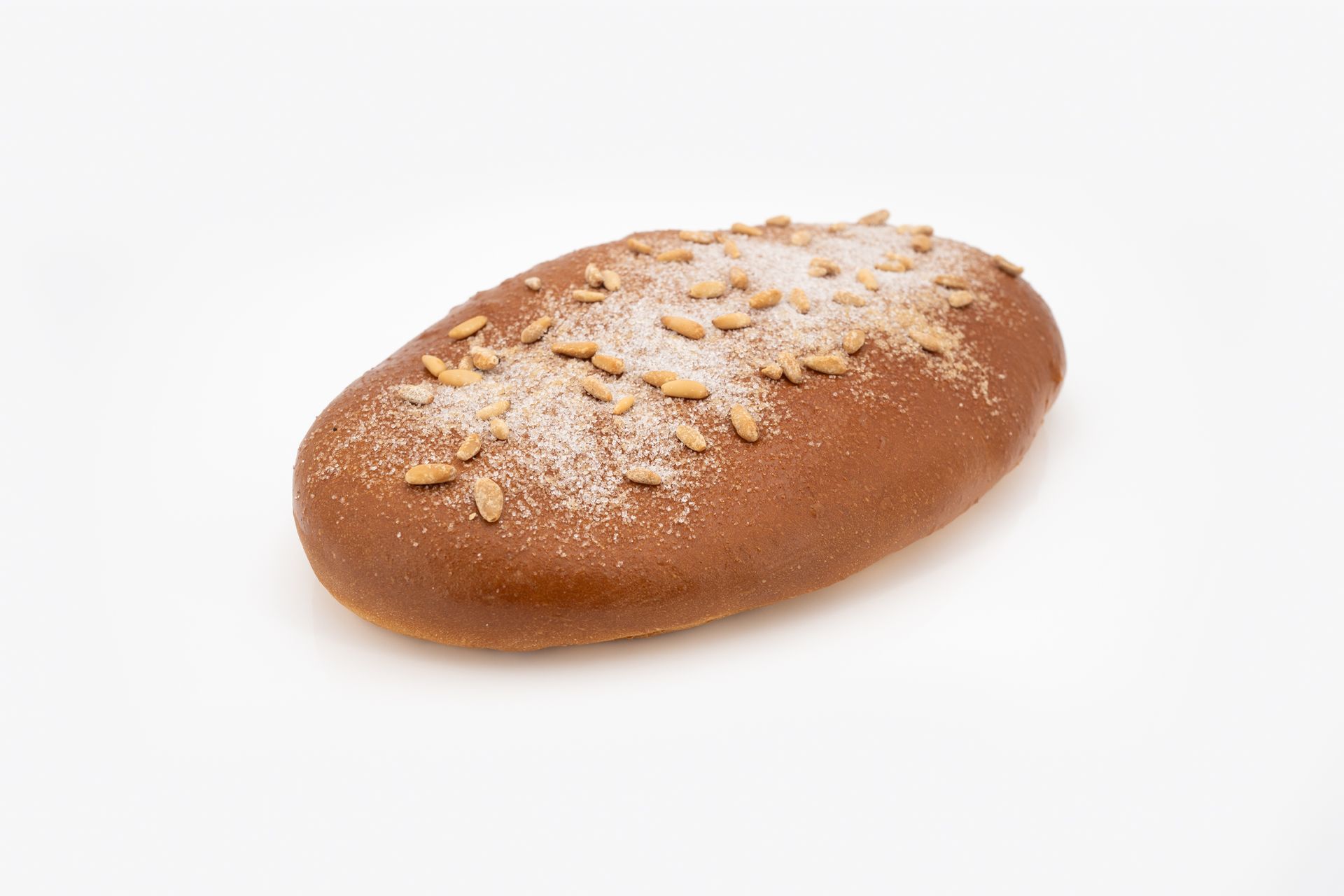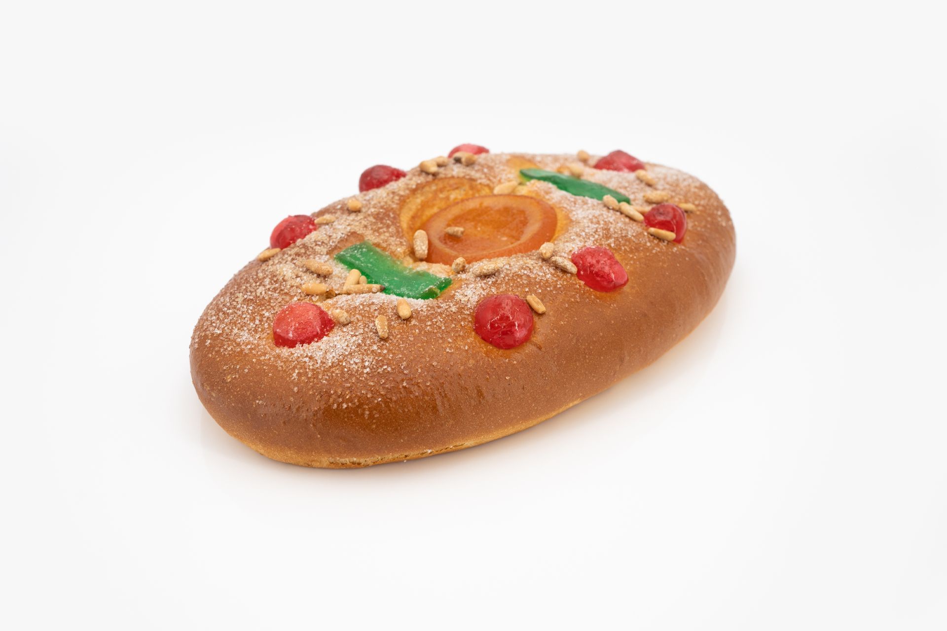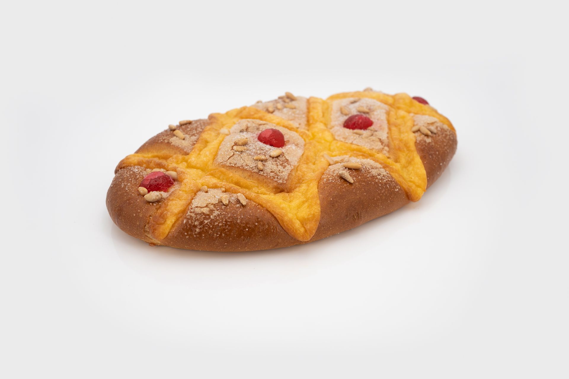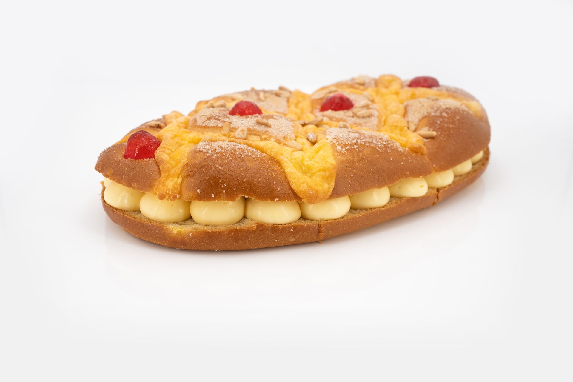 Bizcocho horneado con trozos de fruta confitada, relleno de nata.