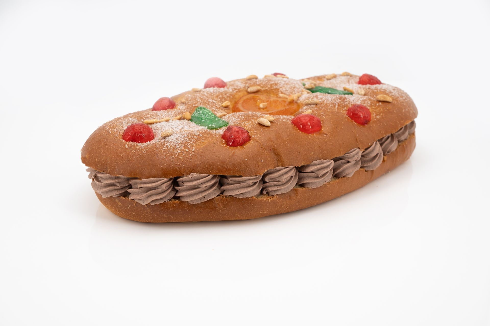 Bizcocho horneado con trozos de fruta confitada, relleno de trufa.