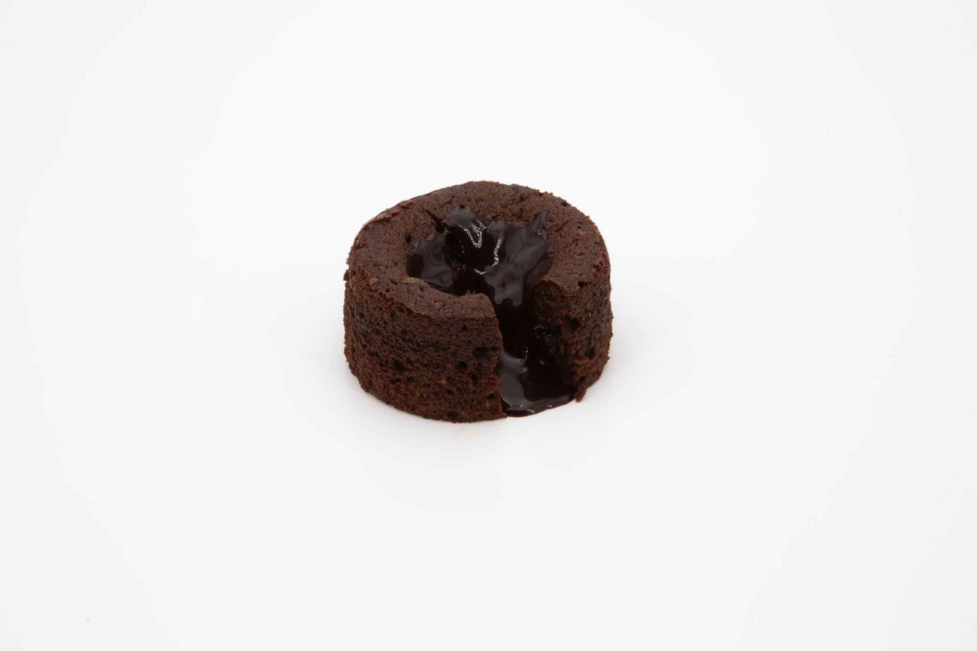 Bizcocho de choclate negro con chocolate negro fundido en su interior.