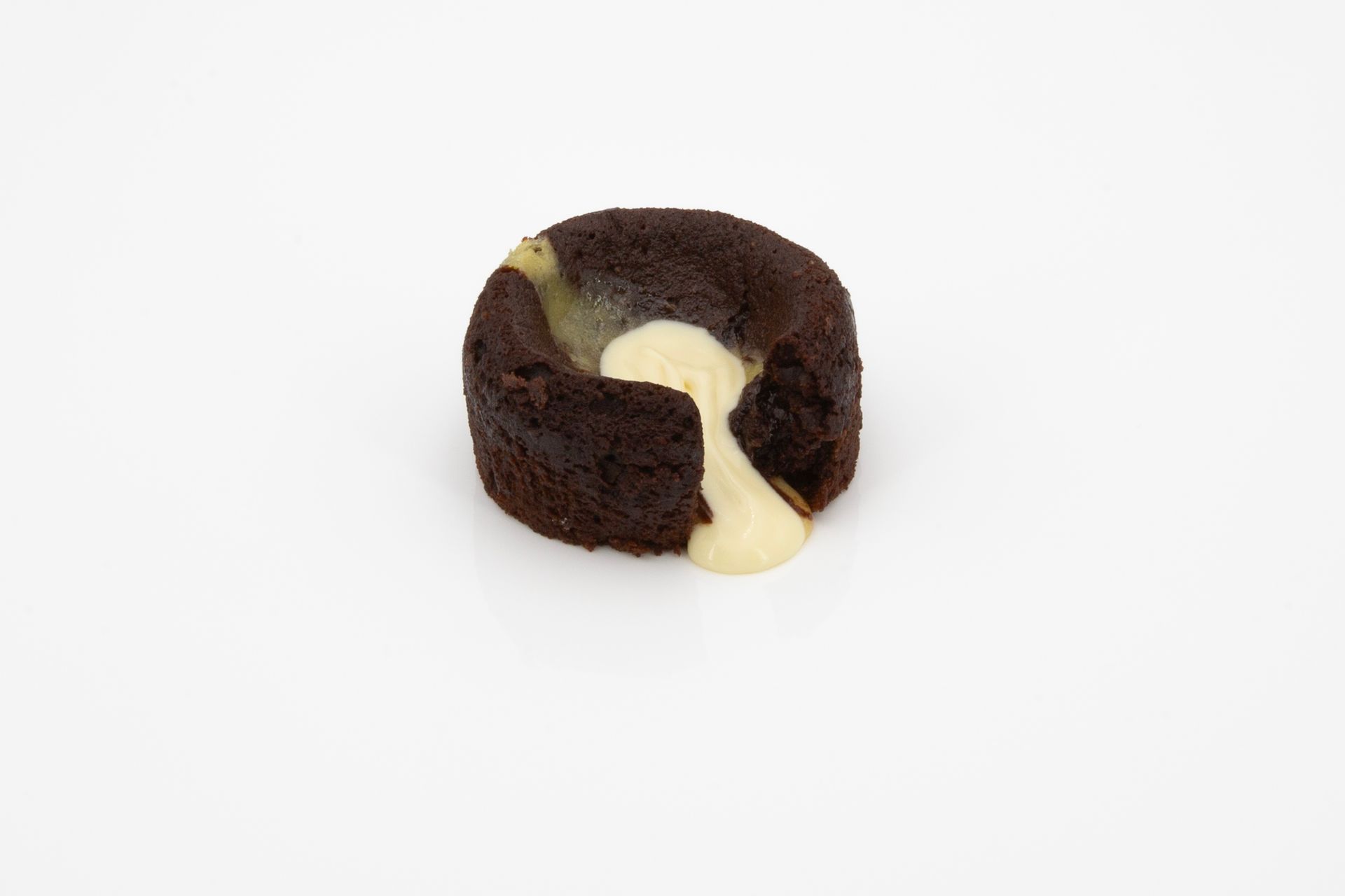 Bizcocho de choclate negro con chocolate blanco fundido en su interior.