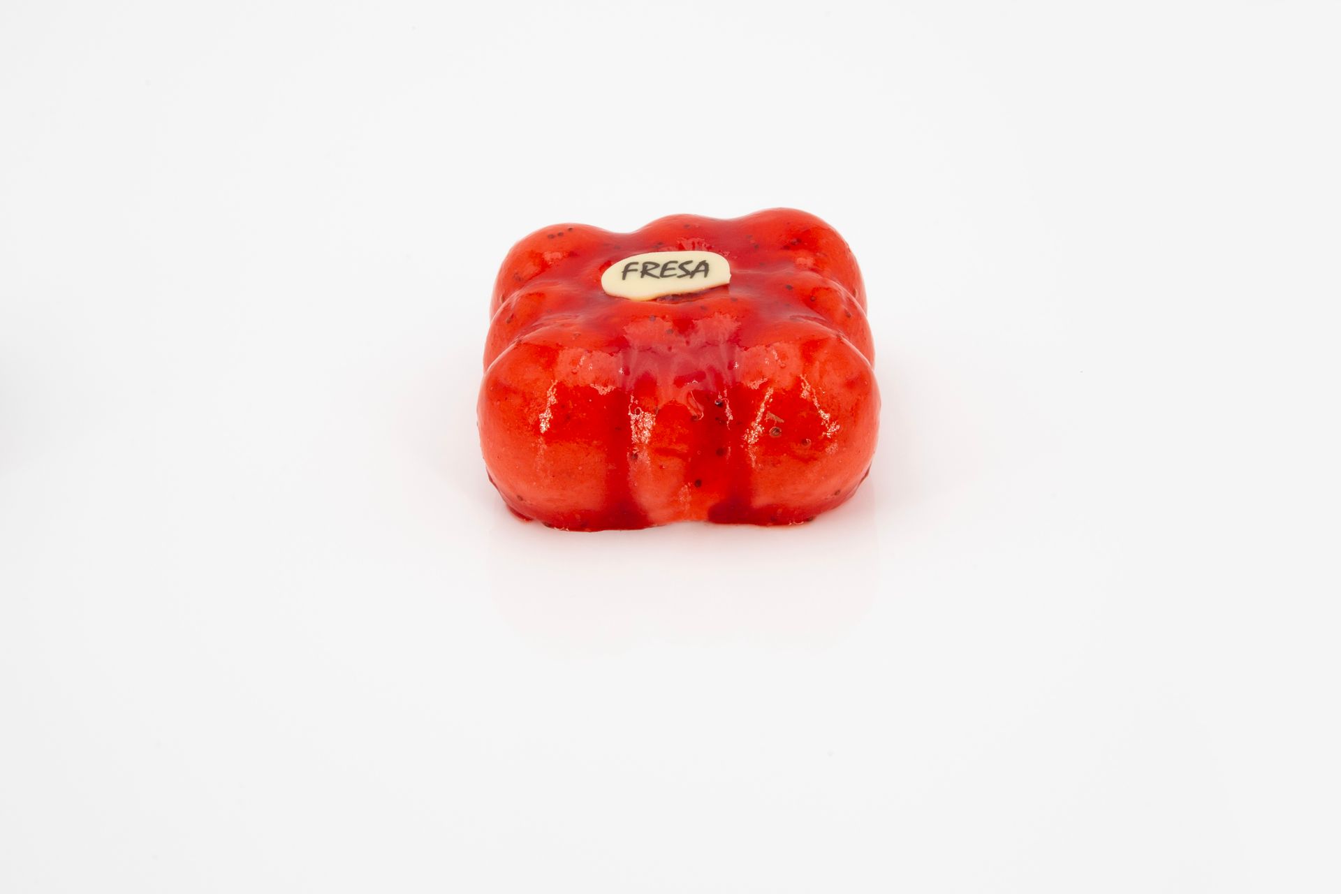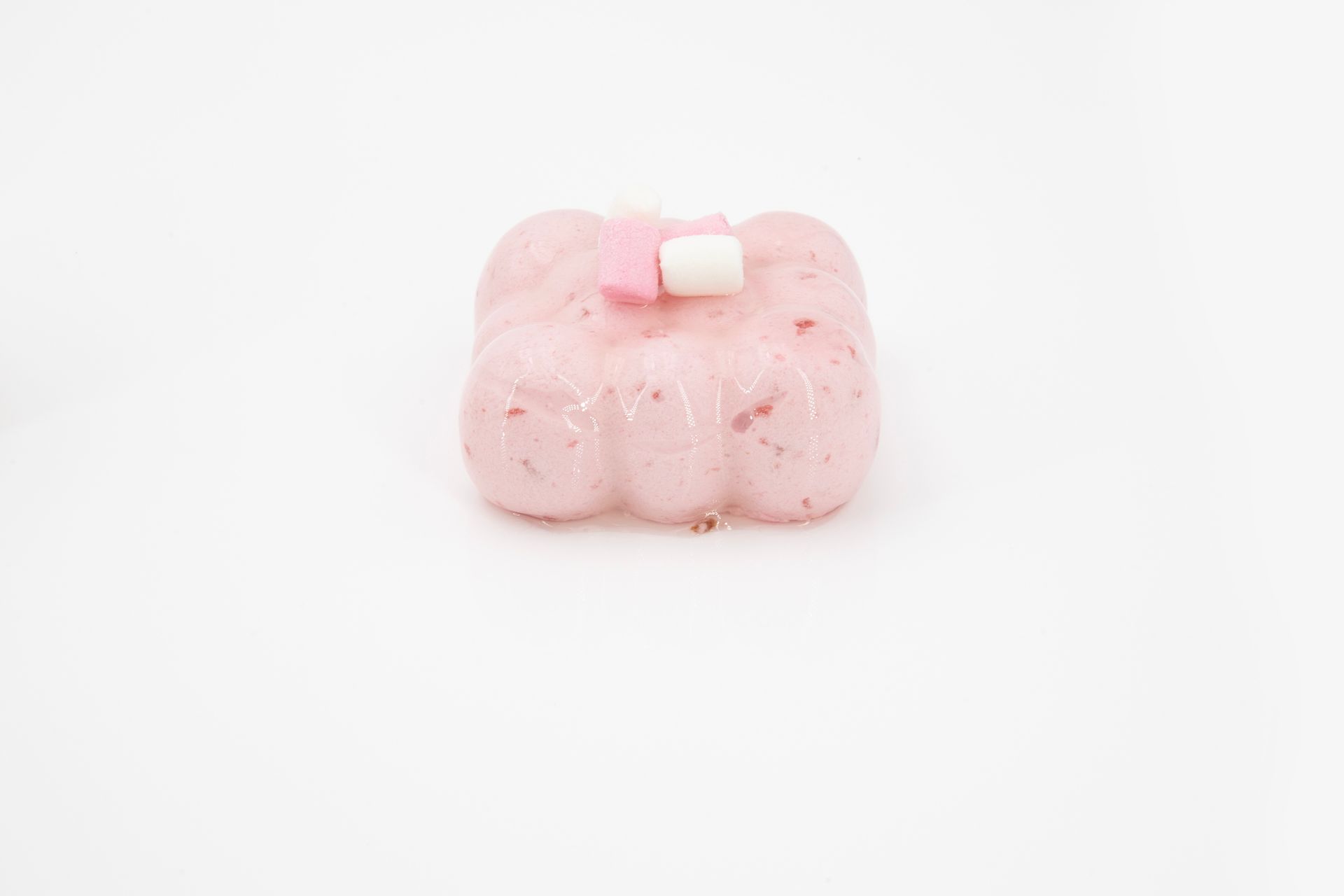 Nube rellena de mousse de fresa, pintada con una fina capa de pintura roja.