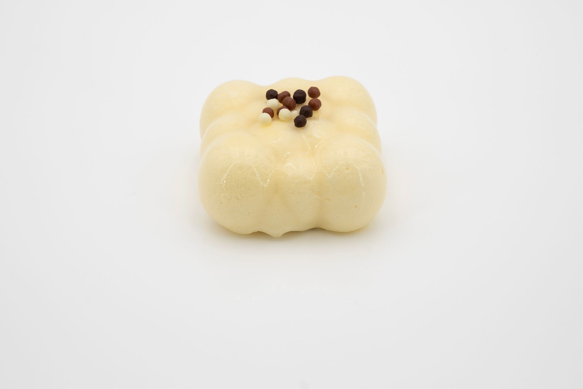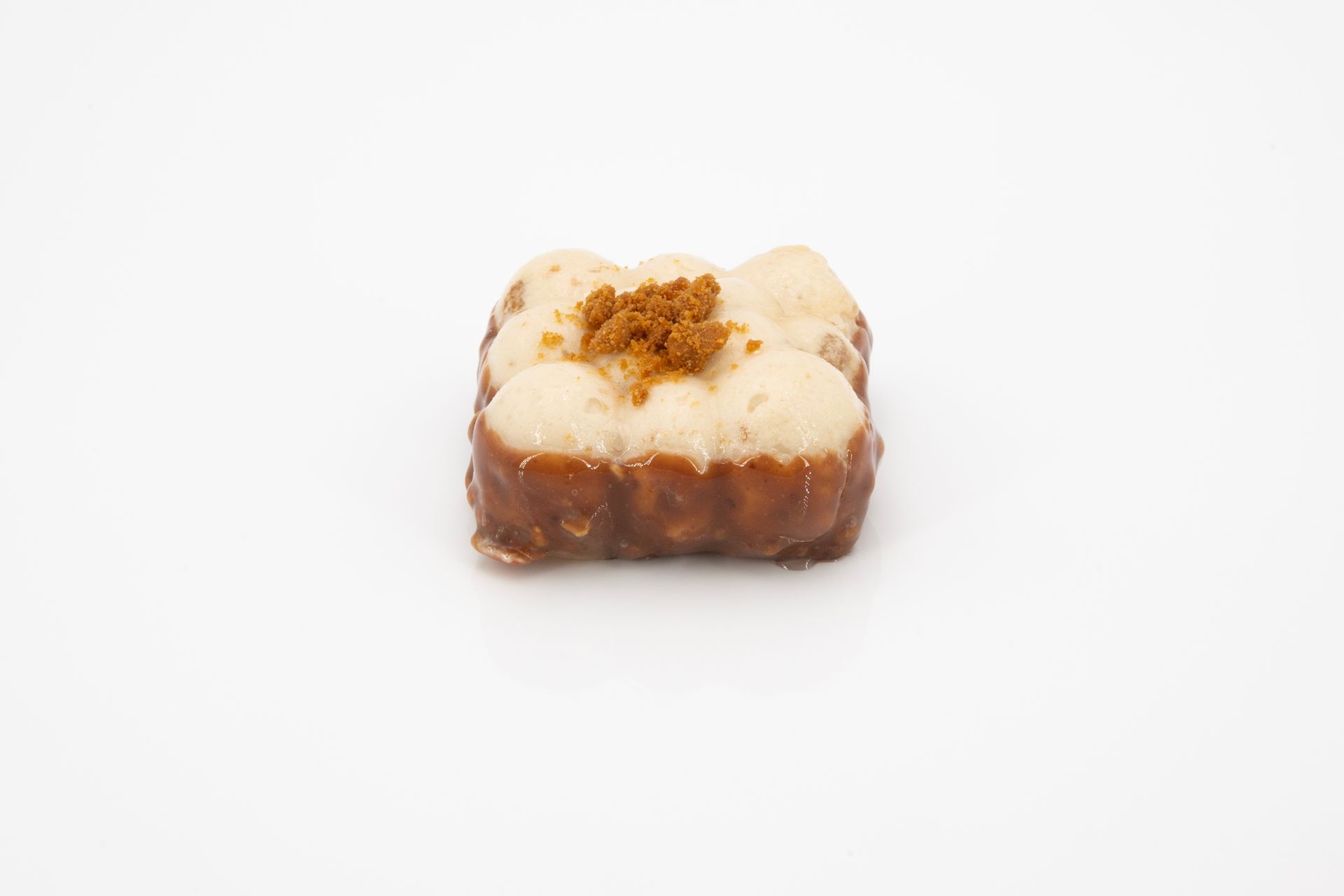 Nube con base de bizcocho, relleno de mousse de crema de lotus, con un baño de chocolate y un baño de gelatina.