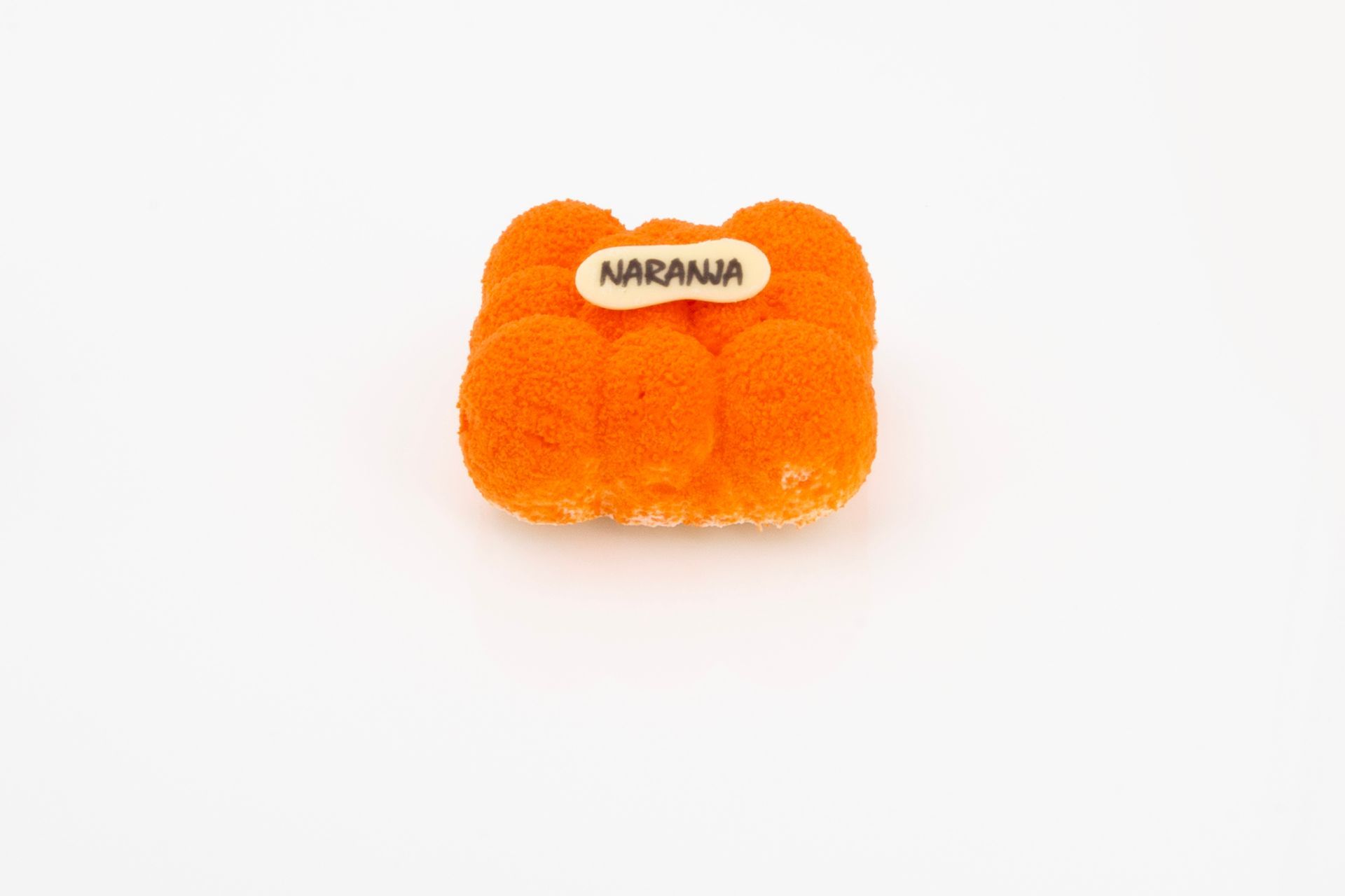 Nube rellena de mousse de naranja, con baño de gelatina.