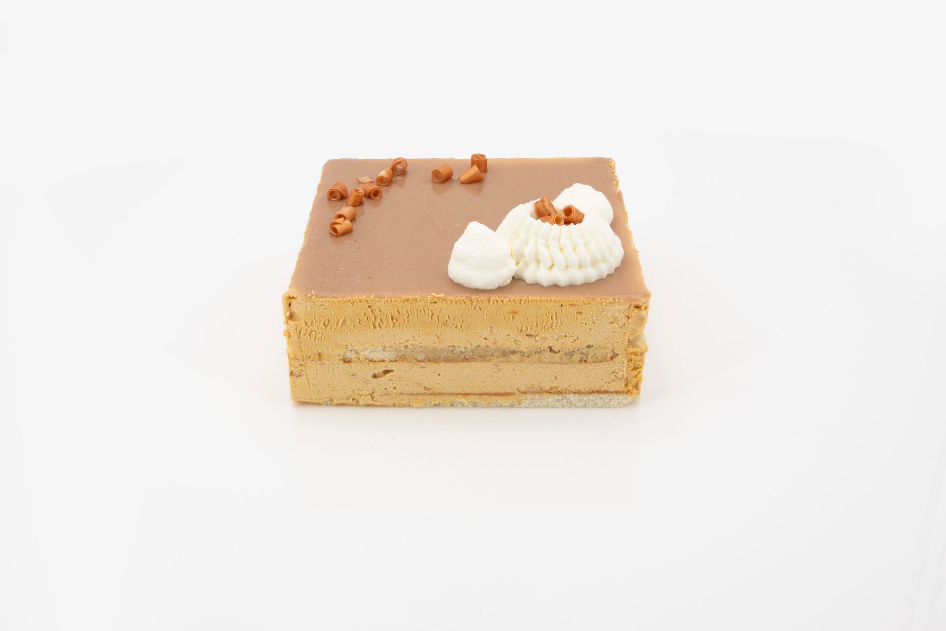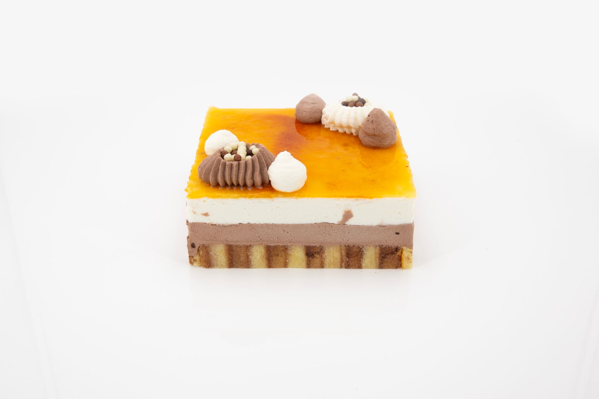 Bizcocho con una capa de nata y otra capa de trufa, acabado con una fina capa de yema quemada.