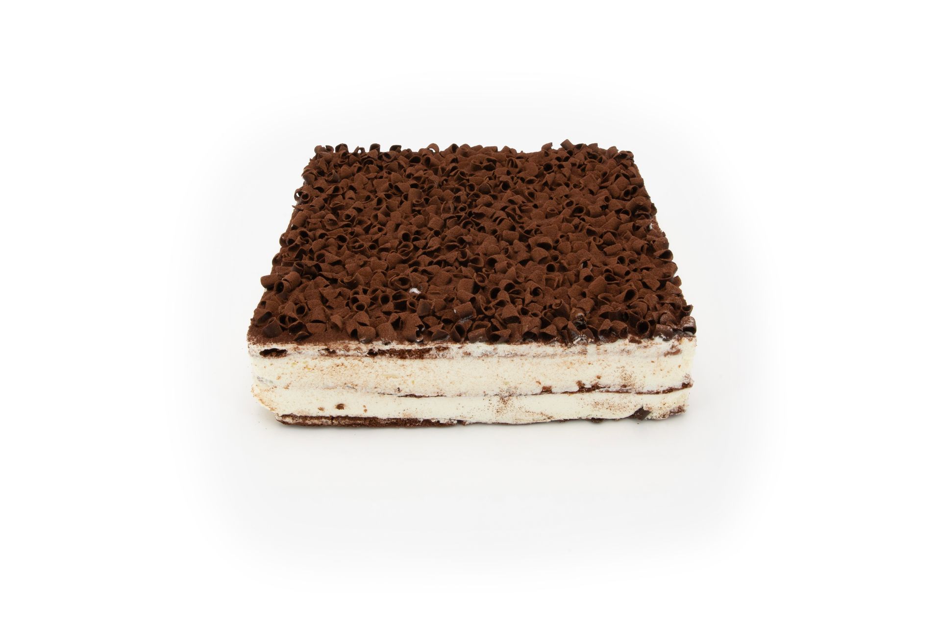 Combinación de capas de bizcocho bañado en almibar de café y crema mascarpone, cubierto con cacao.